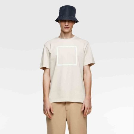 Roomy shirt with round neck and short sleeves. Contrasting front print.